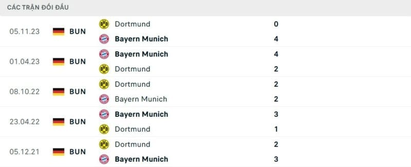 Thành tích đối đầu Bayern Munich vs Dortmund