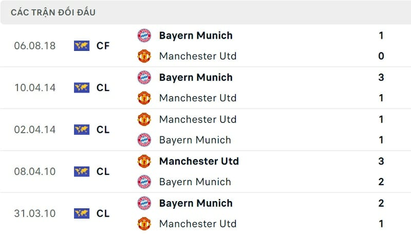 Xưa nay Bayern vẫn thường chiếm thế thượng phong trước Man Utd. Gã khổng lồ nước Đức hạ đối phương 4 lần, trong khi đại diện của Anh quốc chỉ có 2 thắng lợi.