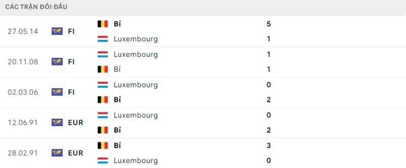 Thành tích đối đầu Bỉ vs Luxembourg