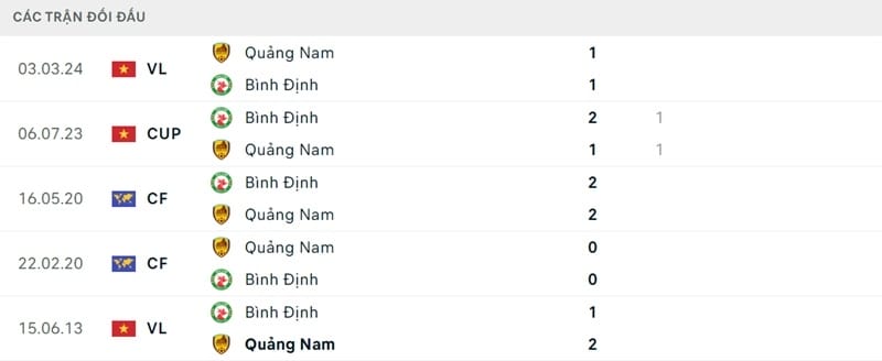 Thành tích đối đầu Bình Định vs Quảng Nam