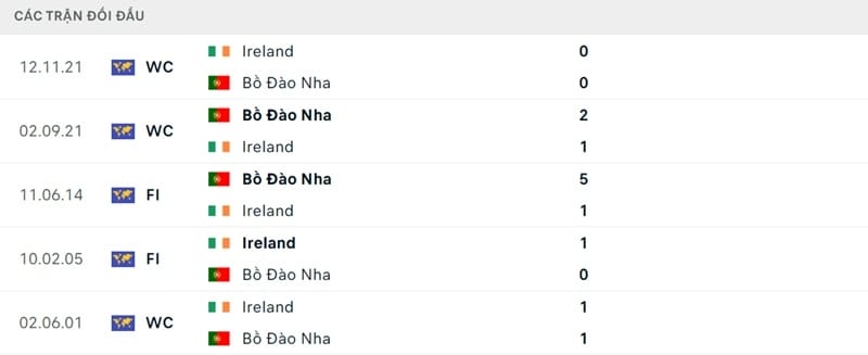 Thành tích đối đầu hoàn toàn ủng hộ Bồ Đào Nha. Sau 15 lần đụng độ gần nhất, Ireland nhận 8 thất bại. Tuy nhiên, ở màn chạm trán tại vòng loại World Cup 2022 mới đây, Ireland kiên cường cầm hòa Bồ Đào Nha 0-0. Tái hiện thành tích đó là kết quả tốt dành cho đội khách.