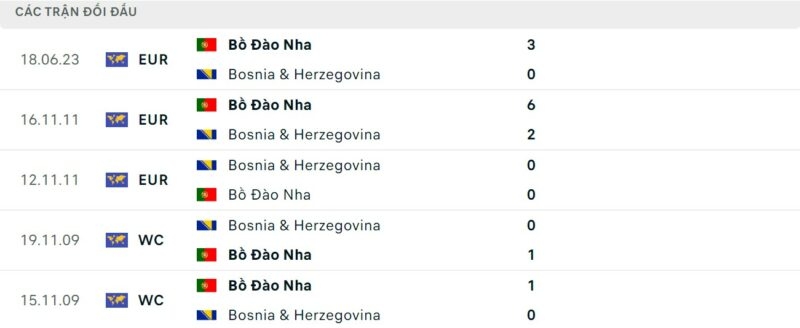 Thành tích đối đầu Bosnia vs Bồ Đào Nha:
