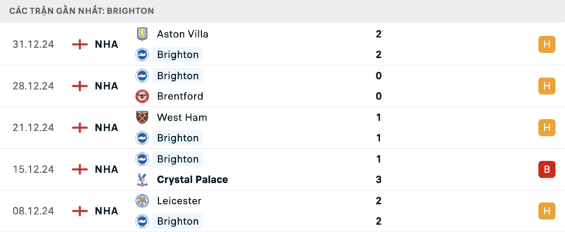 Vấn đề của Brighton đó là họ liên tục để các đối thủ cầm chân. Trận hòa 2-2 với Aston Villa trong ngày cuối năm đã là trận hòa thứ 9 của Mòng biển mùa này, nhiều hơn bất cứ đội nào khác tại giải. Bài toán lực lượng cũng khiến HLV Fabian Hurzeler đau đầu khi ông đang phải đối mặt với 7 ca chấn thương.