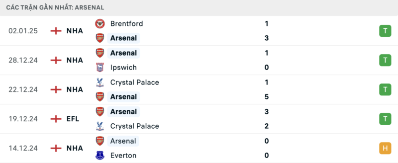Arsenal duy trì phong độ ấn tượng với chuỗi 12 trận bất bại liên tiếp, trong đó toàn thắng 4 trận gần nhất.