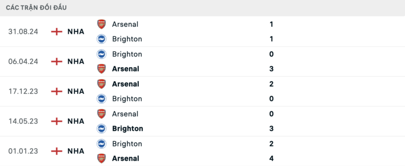 Kết quả đối đầu các trận gần đây nhất của Brighton vs Arsenal