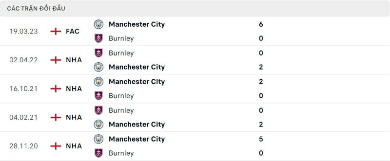 Thông tin đối đầu Burnley vs Man City