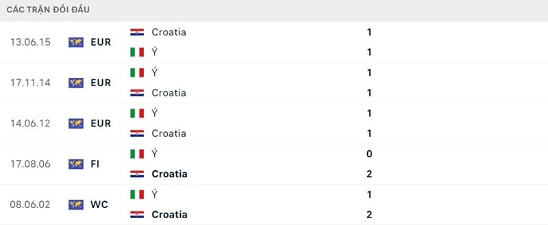 Kết quả đối đầu các trận gần đây nhất của Croatia vs Italia