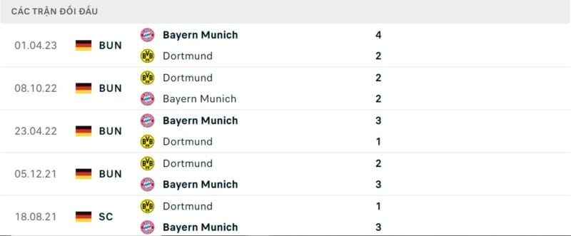 Thành tích đối đầu Dortmund vs Bayern Munich: