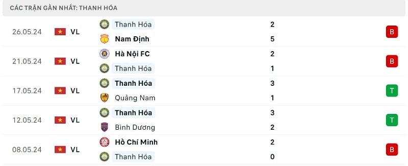 Như vậy, Thanh Hóa hiện đang trải qua chuỗi 2 trận thua liên tiếp. Tính trong 5 trận gần nhất, phong độ của họ cũng khá thất vọng khi giành được 2 chiến thắng và nhận đến 3 thất bại.