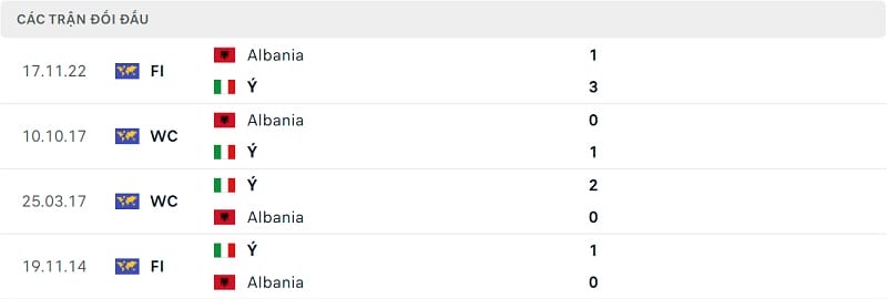 Kết quả đối đầu các trận gần đây nhất của Italia và Albania