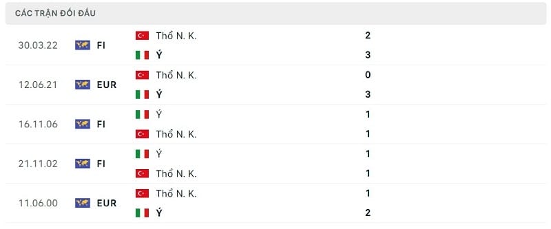 Thành tích đối đầu Italia vs Thổ Nhĩ Kỳ