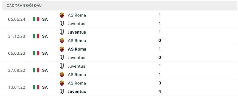Kết quả đối đầu các trận gần đây nhất của Juventus vs AS Roma
