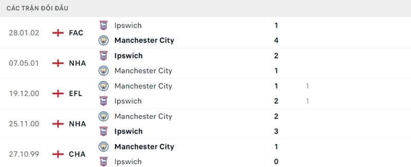 Do lần gần nhất Ipswich Town đá Ngoại hạng Anh là cách đây 22 năm, nên họ sở hữu thành tích đối đầu cân bằng với Man City. Lúc bấy giờ, Man City chưa được túi tiền Ả Rập hậu thuẫn nên sức mạnh của họ khá khiêm tốn.
