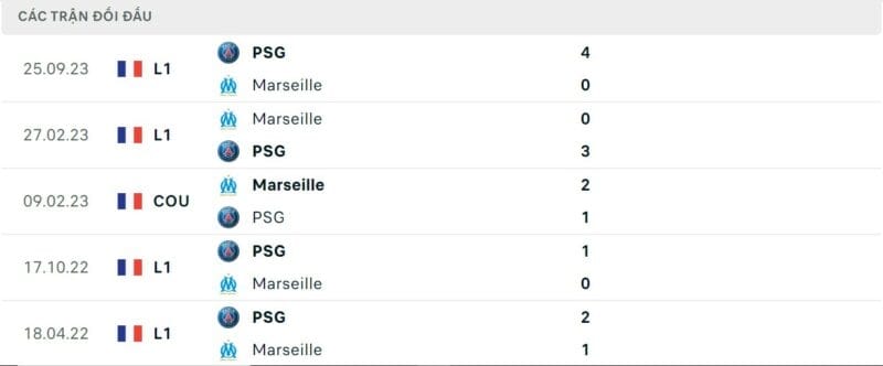 Thành tích đối đầu Marseille vs PSG