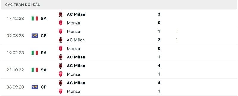 Thành tích đối đầu Monza vs AC Milan: