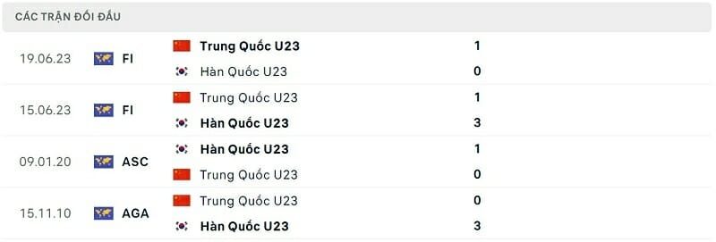 Thành tích đối đầu Olympic Trung Quốc vs Olympic Hàn Quốc: