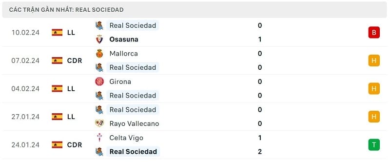 Cụ thể, tính trong 5 trận gần nhất trên mọi đấu trường, đại diện đến từ Tây Ban Nha chỉ giành được duy nhất 1 chiến thắng. Real Sociedad đang trải qua 4 trận liên tiếp không thắng và chuỗi thành tích kém cỏi này khả năng cao sẽ gia tăng bởi những lá thăm may rủi khiến họ phải chạm trán với PSG ở trận đấu tới.
