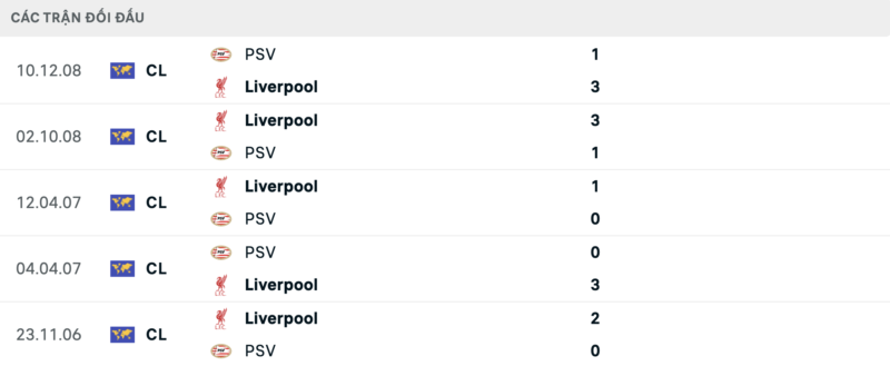 Thành tích đối đầu hoàn toàn nghiêng về phía Liverpool. Họ đã toàn thắng trong 5 lần gần nhất chạm trán PSV.