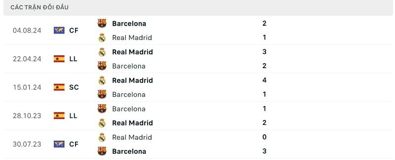 Kết quả đối đầu các trận gần đây nhất của Real Madrid vs Barcelona