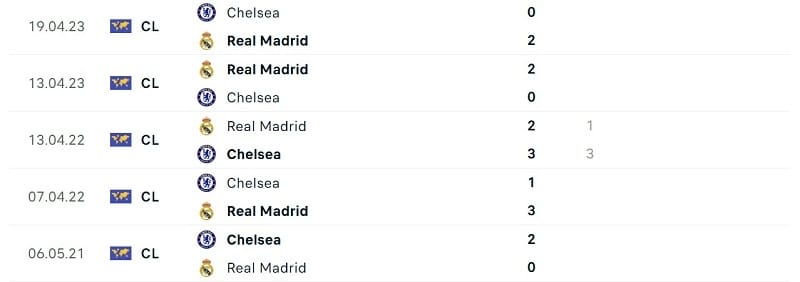 Kết quả đối đầu các trận gần đây nhất của Real Madrid vs Chelsea