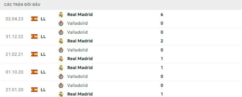 Kết quả các trận đối đầu gần đây giữa Real Madrid vs Real Valladolid