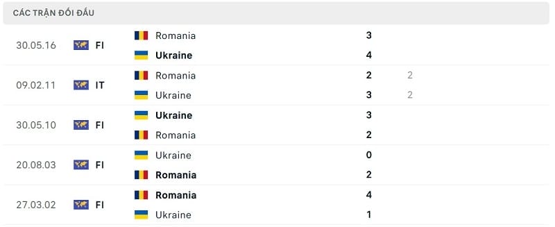 Kết quả đối đầu các trận gần đây nhất của Romania vs Ukraine