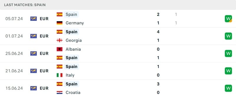 Thắng Đức ở hiệp phụ, Tây Ban Nha là đội duy nhất giành chiến thắng trong cả năm trận đấu cho đến nay. Không có quốc gia nào trong lịch sử Euro giành chiến thắng sáu lần trong một vòng chung kết, hoặc thậm chí giành được sáu chiến thắng liên tiếp.
