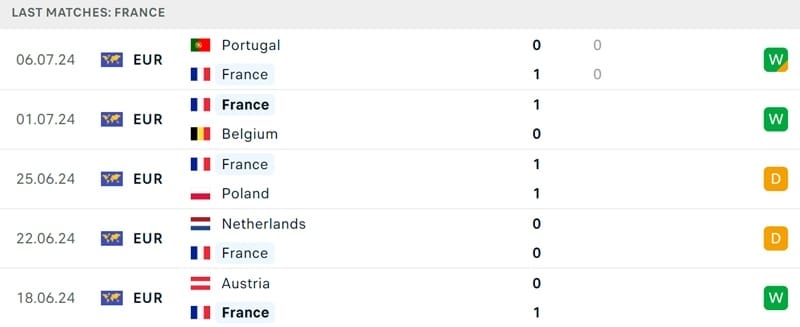 Trong 5 trận gần nhất, Pháp không thua sau 90 phút, với 3 thắng và 2 hòa. Không có trận đấu nào họ ghi hơn 2 bàn bởi gặp vấn đề hàng công.