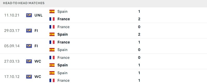 Thắng 2, thua 2 và hòa 1 là thành tích đối đầu trong 5 trận gần đây của Pháp trước Tây Ban Nha. Ở lần chạm trán mới nhất, Pháp đánh bại Tây Ban Nha với tỷ số 2-1 để vô địch UEFA Nations League 2021.