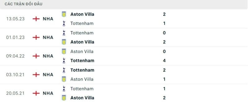 Thành tích đối đầu Tottenham vs Aston Villa: