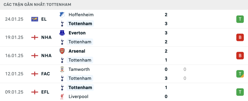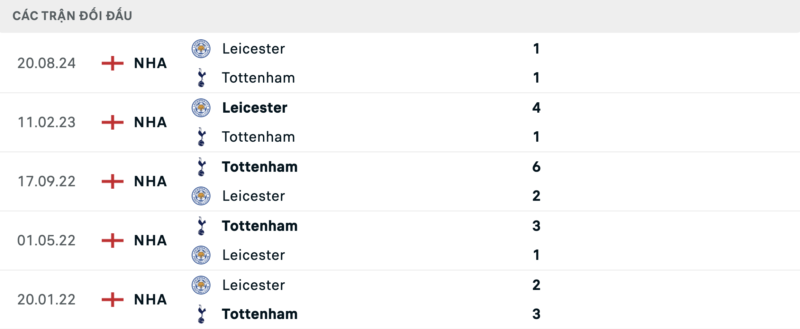 Kết quả đối đầu các trận gần đây nhất của Tottenham vs Leicester