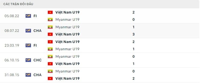 Kết quả đối đầu các trận gần nhất giữa U19 Việt Nam vs U19 Myanmar