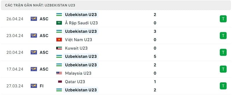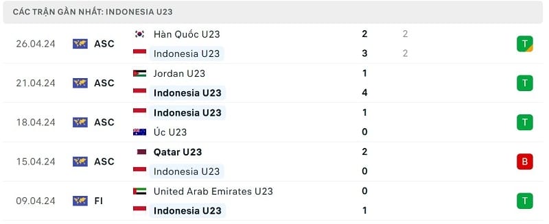 Phong độ gần đây U23 Indonesia vs U23 Uzbekistan