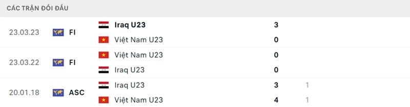 Thành tích đối đầu U23 Iraq vs U23 Việt Nam