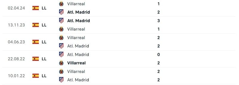 Kết quả đối đầu các trận gần đây nhất của Villarreal vs Atletico Madrid
