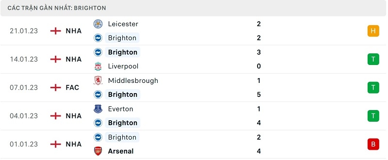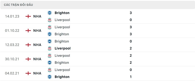 Ghi bàn đang là thứ vũ khí tối thượng của đội chủ sân AMEX mùa này. 5 vòng gần nhất tại Premier League, đoàn quân của HLV Roberto De Zerbi chọc thủng lưới đối phương tới 14 lần. 3 trong số đó được ghi vào lưới Liverpool trong trận đấu giữa 2 đội cách đây 15 ngày. Phong độ cao giúp Brighton đứng thứ 6 trên BXH.