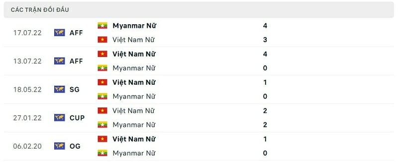 Về mặt tỷ số, người hâm mộ có thể mong chờ một màn so tài với nhiều bàn thắng được ghi. Bên cạnh đó, thống kê còn cho thấy 2 trận đối đầu gần nhất giữa ĐT nữ Myanmar và Việt Nam đều có từ 4 bàn thắng trở lên.
