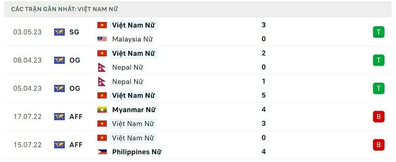 Phong độ gần đây ĐT nữ Myanmar vs ĐT nữ Việt Nam: