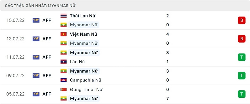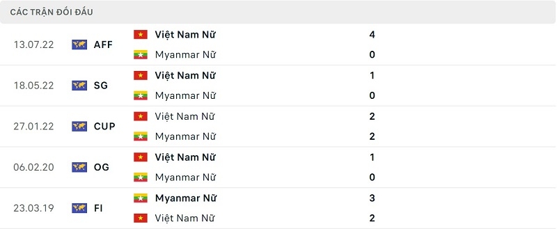 Thành tích đối đầu ĐT nữ Việt Nam vs ĐT nữ Myanmar: