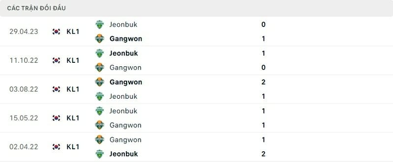 Thành tích đối đầu Gangwon vs Jeonbuk