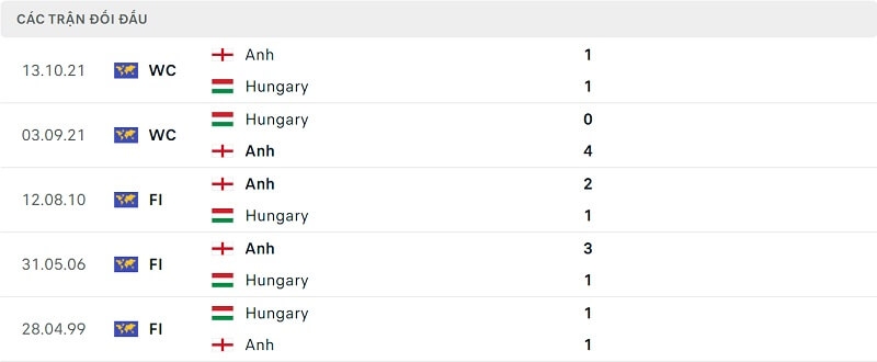 Thành tích đối đầu Hungary vs Anh: