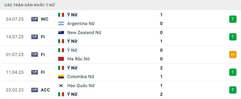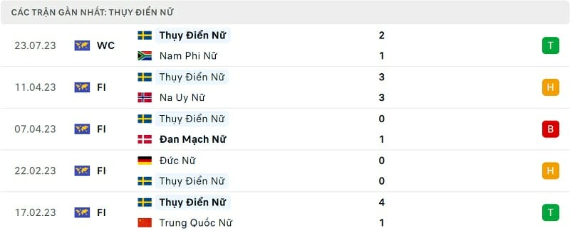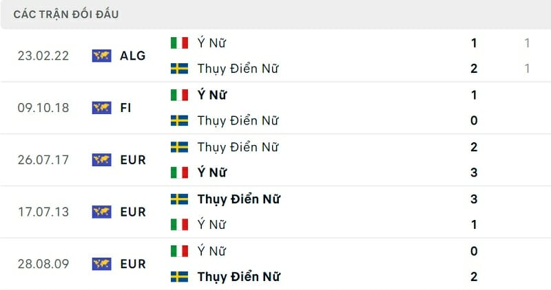 Thành tích đối đầu nữ Thụy Điển vs nữ Italia