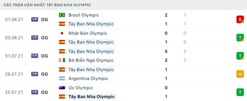 5 lần ra sân gần nhất, Olympic Tây Ban Nha thắng 3, thua 1 và hoà 1. Song, cần lưu ý, do đội trẻ này ít ra sân, nên các trận đấu đó đã diễn ra từ năm 2021, tức kỳ Olympic mới đây nhất.