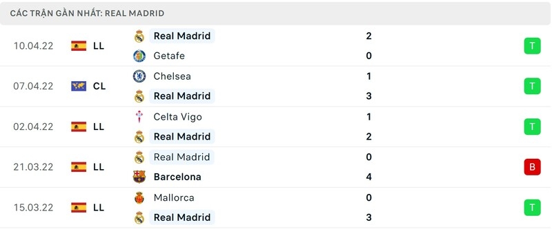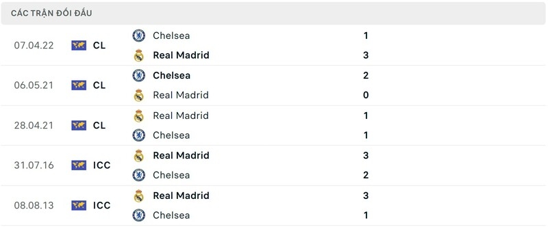 Thành tích đối đầu Real Madrid vs Chelsea: