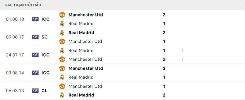 Thành tích đối đầu Real Madrid vs Man United
