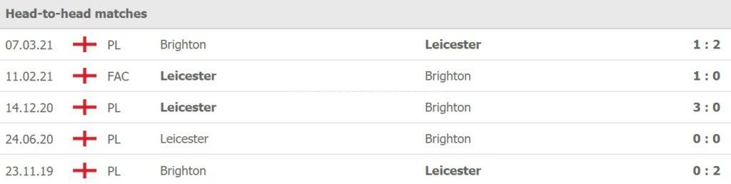 Lịch sử đối đầu đang ủng hộ Leicester. Bầy Cáo bất bại trong 5 lần gặp nhau gần nhất, trong đó có đến 4 chiến thắng. Nhưng chưa lúc nào Brighton đáng gờm như hiện tại. Cộng với lợi thế sân nhà, Chim mòng biển chắc chắn chưa muốn chuỗi ngày tươi đẹp phải kết thúc. Một trận đấu khó đoán, có thể không nhiều bàn thắng nhưng trông rất căng thẳng và kịch tích.