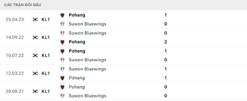 Thành tích đối đầu Suwon Bluewings vs Pohang