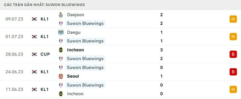 Suwon Bluewings ở vòng đấu vừa qua đã cho thấy màn trình diễn khá ấn tượng trước Daejeon. Dù bị dẫn trước từ sớm nhưng các học trò của HLV Kim Byung-soo đã san bằng cách biệt trong hiệp 2. Tuy nhiên bấy nhiêu là vẫn chưa đủ để vực dậy thành tích yếu kém của Suwon Bluewings.