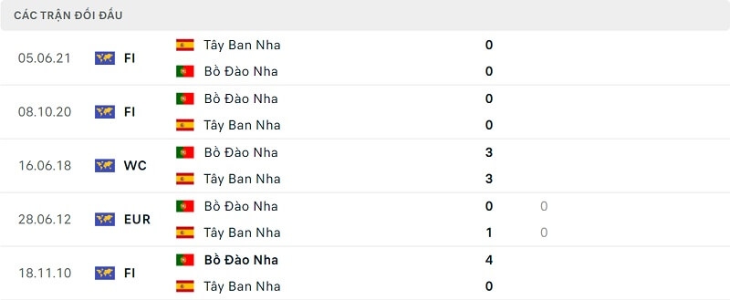 Ở 2 lần chạm trán gần nhất, Bồ Đào Nha và Tây Ban Nha đều rời sân với kết quả hòa 0-0. Đây đều là những trận giao hữu vô thưởng vô phạt. Lần cuối cùng 2 đội bóng của bán đảo Iberia so tài nhau trong một giải đấu chính thức là tại vòng bảng của World Cup 2018. Khi ấy, tỷ số trận đấu là 3-3 với điểm nhấn là cú hat-trick kinh điển của Ronaldo vào lưới David de Gea. Vì thế, khả năng hai đội tiếp tục hòa nhau sẽ rất lớn.
