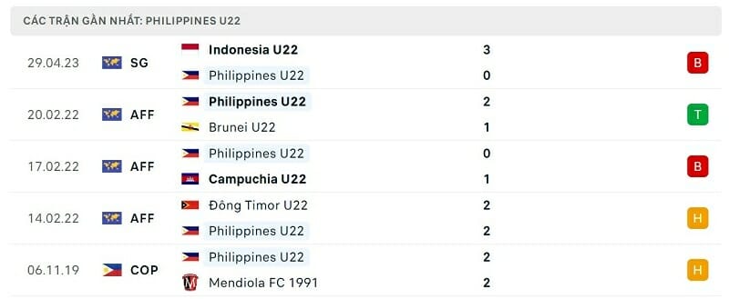 Phong độ gần đây U22 Philippines vs U22 Campuchia: